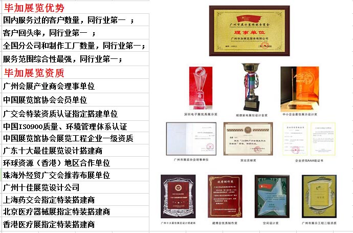 廣州畢加展覽服務(wù)有限公司成立于2008年,注冊資金600萬。專注于展館展廳設(shè)計(jì)施工、主場策劃執(zhí)行、展臺(tái)設(shè)計(jì)搭建為展覽營銷一體化工程的專業(yè)總承包服務(wù)企業(yè)。為服務(wù)于企業(yè)營銷多元化,畢加先后成立了品牌策劃設(shè)計(jì)、活動(dòng)策劃執(zhí)行、互動(dòng)多媒體開發(fā)、宣傳片制作、管理軟件研發(fā)、網(wǎng)絡(luò)推廣策劃等各專業(yè)團(tuán)隊(duì)。在管理上統(tǒng)一運(yùn)用展覽工程ERP系統(tǒng)管理,在國內(nèi):廣州、北京、上海、深圳、長沙、成都、重慶、武漢、南昌、內(nèi)蒙古、德國、新加坡、緬甸等地均設(shè)有分公司和制作工廠,總面積達(dá)10萬多平方米。畢加成功為吳太集團(tuán)、哈藥集團(tuán)、匯仁集團(tuán)、貝克聯(lián)合制藥、修正藥業(yè)、大紅鷹、華源醫(yī)藥等大型醫(yī)藥品牌企業(yè)專業(yè)打造了實(shí)效的營銷型展臺(tái),并獲得一致好評。