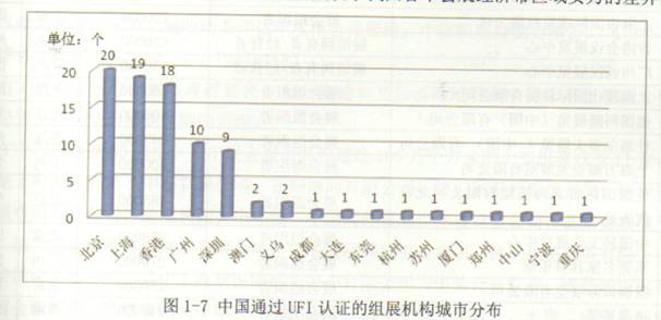 截止2012年三月底,中國共有90家組展機構(gòu)通過UFI(國際展覽業(yè)聯(lián)盟)認證,而中國這90個UFI會員主板的獲得UFI認證的國際性展會為59個,只及德國的49.6%.