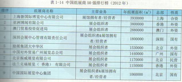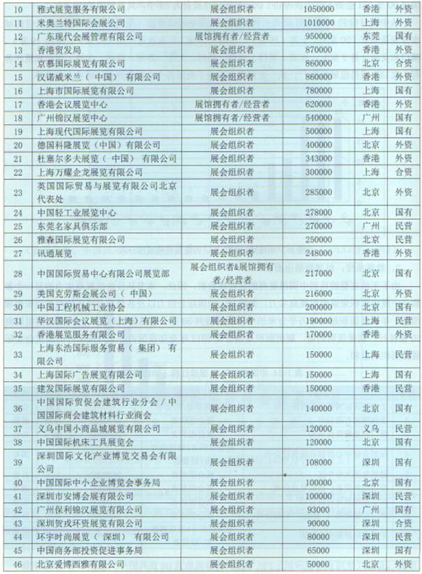 由于無法完整的找到中國組展商的營業(yè)額數(shù)據(jù),因此,本節(jié)從反映組展商實力的另一個參數(shù)——展出面積來說明組展商實力,參照UFI的國際公信力以及各展覽公司年均組展面積兩項指標,年組展面積超出3萬平方米的中國組展商共50家(包括港澳地區(qū)),構(gòu)成中國組展商50強排行,需要說明的是,展出面積是該公司2012年全年在國內(nèi)外主辦或者承辦的展覽會實際展出面積的總和。