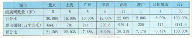 在組展商數(shù)量上,億北京、香港和上海的組展商實力最強。在50強中,北京占據(jù)15家,占比30%,排名第一;香港11家,占比22%,排名第二;上海8家占比16%,位列第三;第四是深圳,有6家,占比12%廣州第五,有5家,占比10%,澳門1家,占比2%,、其他省市(大連、東莞、寧波、義烏)共4家,占比8%。從比例上看,香港與北上廣深占據(jù)絕對優(yōu)勢,絕大多數(shù)的組展商都集中在這幾個中國最發(fā)達的城市。