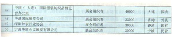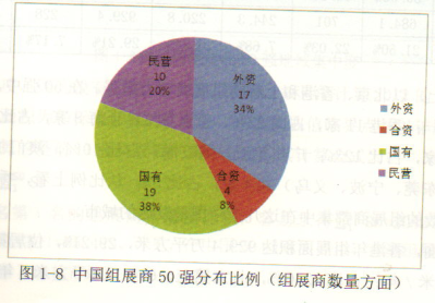 在中國組展商50強中,全年展會展出面積超過100萬平方米的大型組展商有11家,他們分別是上海新國際博覽中心有限公司、亞洲博聞有限公司、澳門貿(mào)易投資促進局、深圳會展中心管理有限責(zé)任公司、勵展集團大中華區(qū)、中國對外貿(mào)易廣州展覽總公司、北京振威展覽有限公司、法蘭克福展覽(香港)有限公司,中國國際展覽中心集團、雅式展覽服務(wù)有限公司、米奧蘭特國際會展公司。其中上海新國際博覽中心有限公司為中德合資企業(yè),幾時展館擁有者,又是展會組織者;勵展集團大中華區(qū)、亞洲博聞、法蘭克福(香港)、米奧蘭特軍事外資會展公司;深圳會展中心管理有限責(zé)任公司、中國對外貿(mào)易廣州展覽總公司、中國國際展覽中心集團為國有企業(yè);雅式展覽服務(wù)有限公司、澳門貿(mào)易投資促進局是澳門企業(yè)、只有北京振威是民營企業(yè)。可見,我國民營展覽企業(yè)實力堪憂,