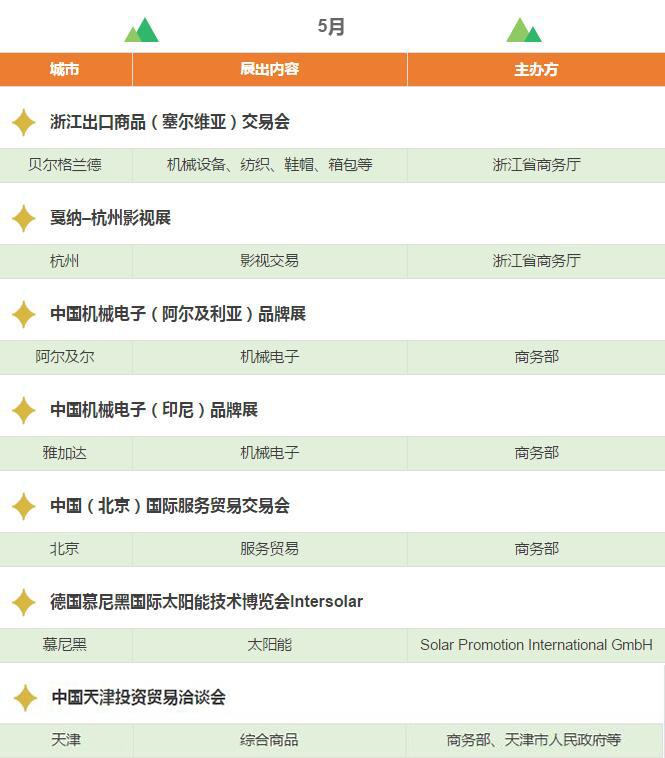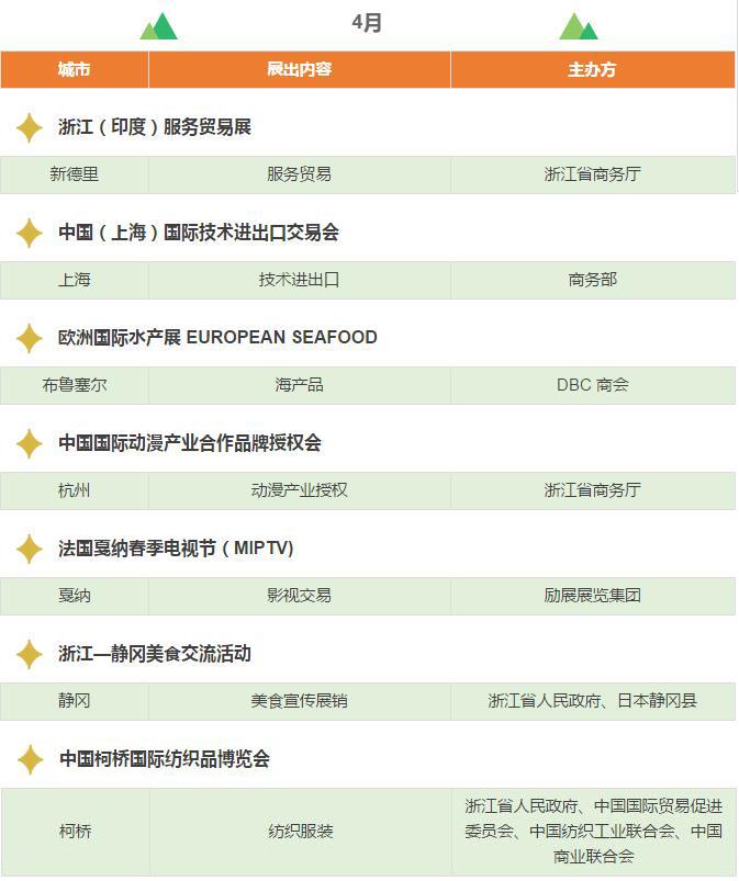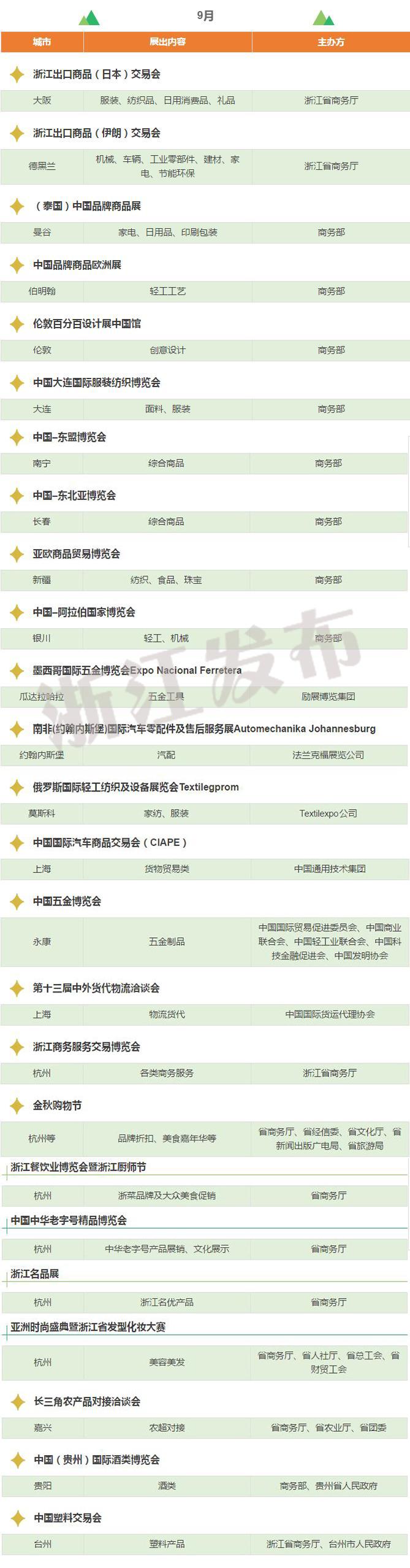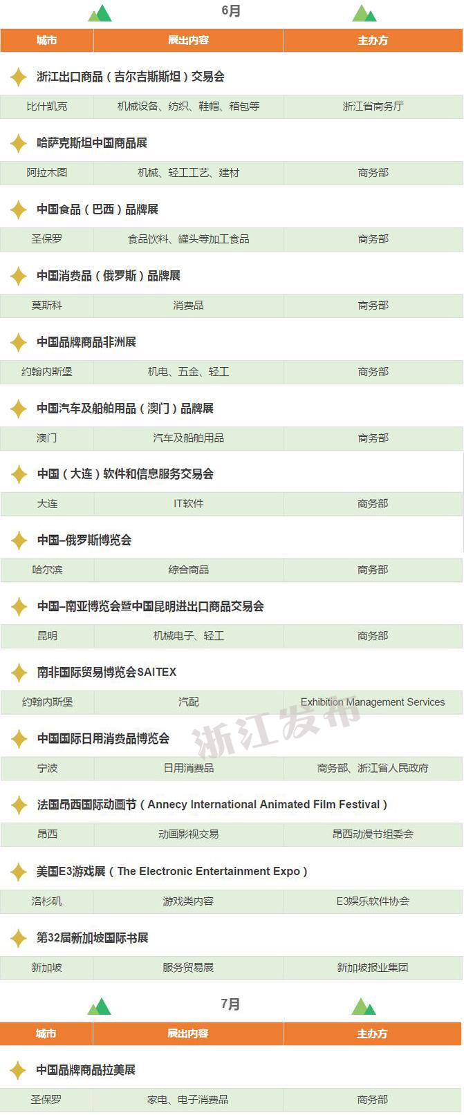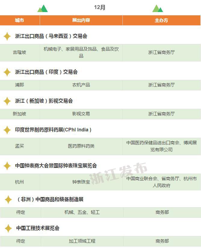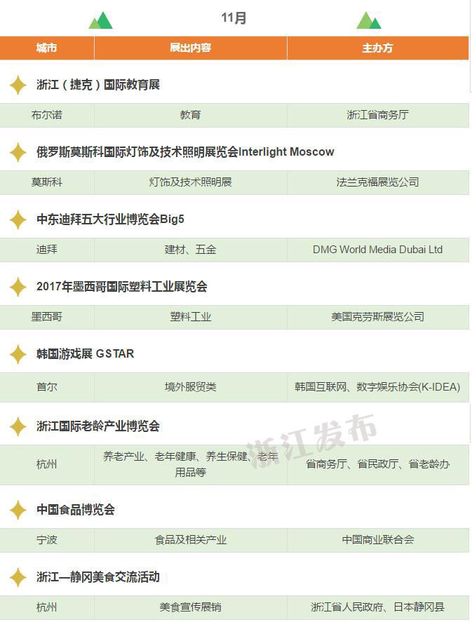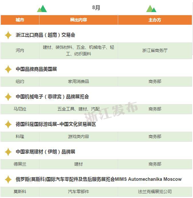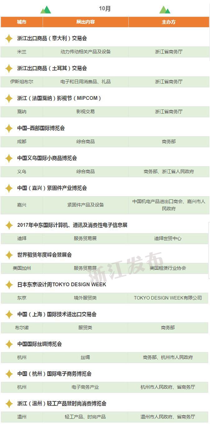 2017年,浙江將重點(diǎn)舉辦和支持96個(gè)展會(huì),其中自辦類貨物貿(mào)易展會(huì)12個(gè),自辦類服務(wù)貿(mào)易展會(huì)5個(gè),境外政策性重點(diǎn)展17個(gè),境內(nèi)政策性重點(diǎn)展11個(gè),其他類重點(diǎn)展36個(gè),商貿(mào)流通展會(huì)15個(gè)!