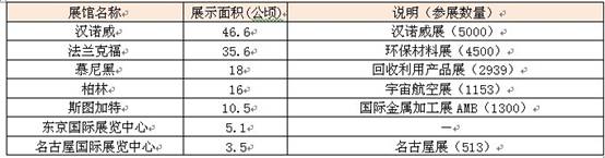德國有22個國際展館,下表為德國幾個展館與日本兩大展館的對比數(shù)據(jù)。由此可見,號稱世界最大的漢諾威展館的展示面積是名古屋國際展覽中心展示面積的13倍多。而德國國內相對較小的斯圖加特展館,其展示面積也是號稱日本展示面積最大的東京國際展覽中心的兩倍多。?