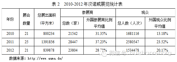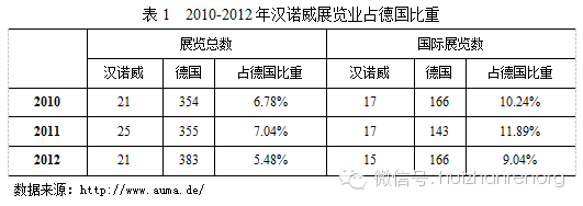 根據(jù)德國展覽業(yè)協(xié)會(AUMA)統(tǒng)計,2010年至2012年,漢諾威舉辦展覽會的總數(shù)占德國的比重基本上維持在5%到7%之間,2012年有所下降;而舉辦國際性展覽會的數(shù)量占德國總國際展的比重基本在9%到12%之間,2012年也有所下降(表1)。