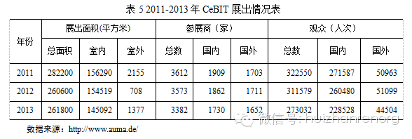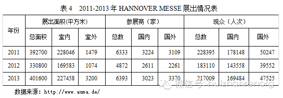 據(jù)國際展覽聯(lián)盟(UFI)統(tǒng)計,2012年漢諾威舉辦的21個主要展覽會總展出面積達95.5萬平方米,參展商達2.4萬家,其中國外參展商近萬家,參觀觀眾總數(shù)達183萬人,國外觀眾達32萬人(表3)。