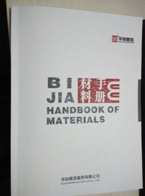 為了提供給新老客戶更好的服務(wù),為了讓展商更好地了解展覽施工材料以及公司內(nèi)部學(xué)習(xí),畢加于近期推出材料手冊(cè)。本手冊(cè)共兩百頁(yè),包含九大部分:主題結(jié)構(gòu)、面層材料、地面材料、燈具線料、廣告材料美工、裝飾配件、新型材料、配套工程以及色板。