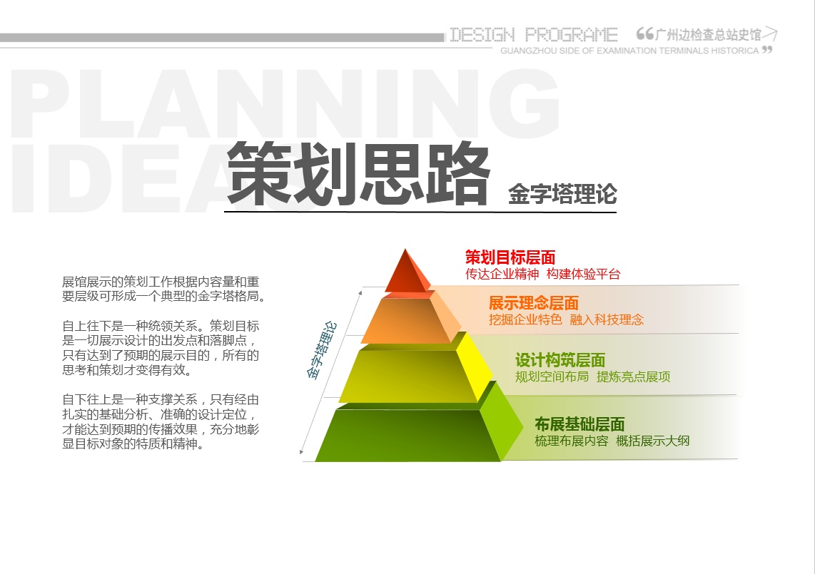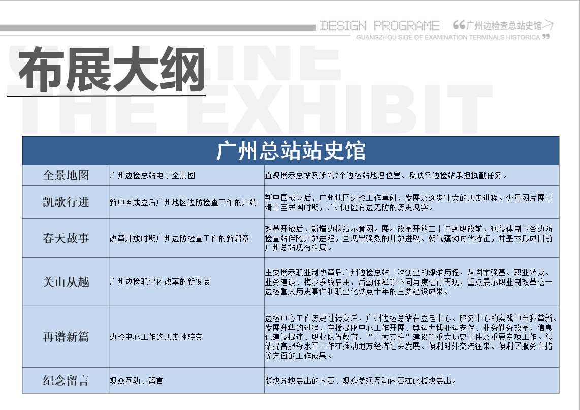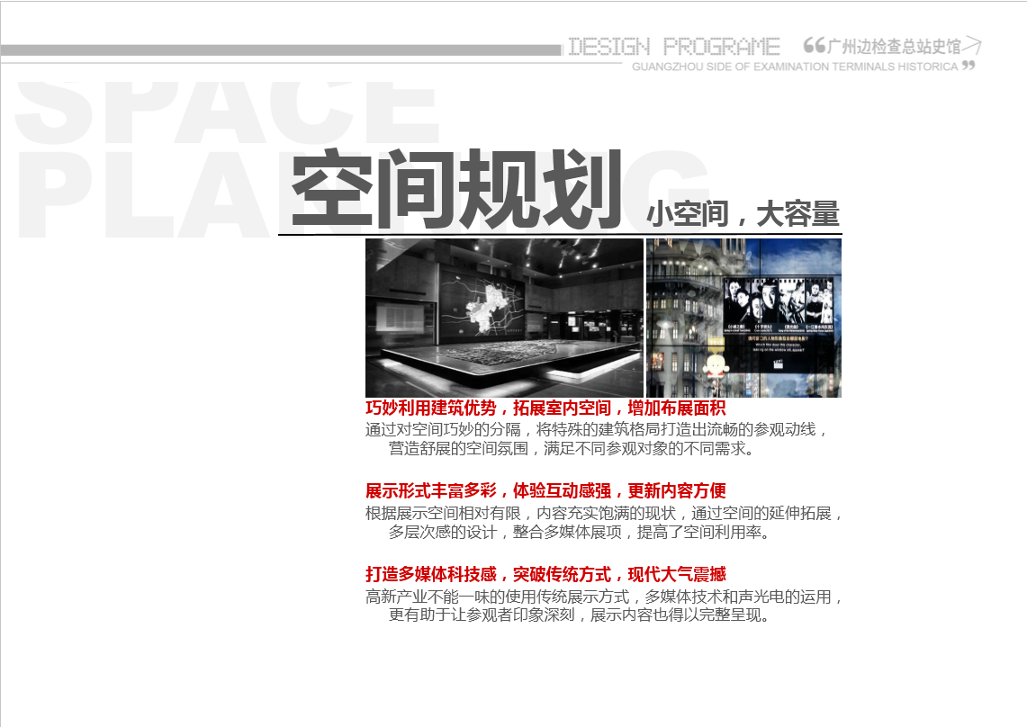 廣州邊檢史館——歷史館設(shè)計(jì)裝修,巧妙利用建筑優(yōu)勢(shì),拓展室內(nèi)空間,增加布展面積——通過(guò)對(duì)空間巧妙的分隔,將特殊的建筑格局打造出流暢的參觀動(dòng)線,營(yíng)造舒展的空間氛圍,滿足不同參觀對(duì)象的不同需求。展示形式豐富多彩,體驗(yàn)互動(dòng)感強(qiáng),更新內(nèi)容方便——根據(jù)展示空間相對(duì)有限,內(nèi)容充實(shí)飽滿的現(xiàn)狀,通過(guò)空間的延伸拓展,多層次感的設(shè)計(jì),整合多媒體展項(xiàng),提高了空間利用率。打造多媒體科技感,突破傳統(tǒng)方式,現(xiàn)代大氣震撼——高新產(chǎn)業(yè)不能一味的使用傳統(tǒng)展示方式,多媒體技術(shù)和聲光電的運(yùn)用,更有助于讓參觀者印象深刻,展示內(nèi)容也得以完整呈現(xiàn)。