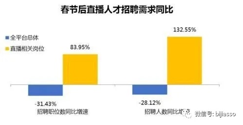 2020年春節(jié)復(fù)工后一個月內(nèi),直播相關(guān)崗位招聘職位數(shù)同比上漲83.95%,招聘人數(shù)增幅高達(dá)132.55%。