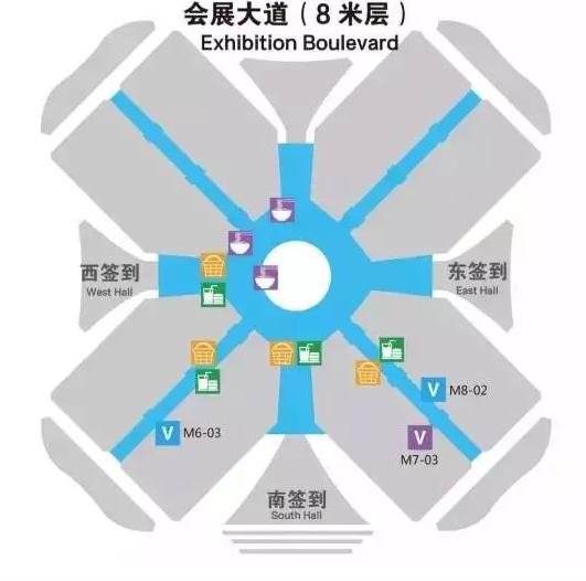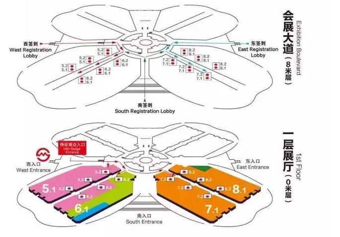 ▲ 整個展館分為三層,一層展館(0M層)和二層展館(16M層)為展廳,中間的會展大道層(8M層)為簽到點和會議室。