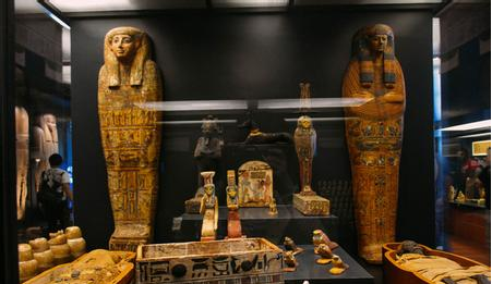 一邊是有著3000多年歷史的古埃及年輕女性木乃伊和人形蓋板,一邊是約有2100年歷史的中國漢墓金縷玉衣和玉棺,展廳內光線黯淡,紗幔輕墜,充滿神秘氛圍。