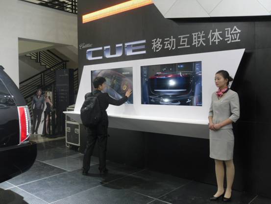 作為競爭對手,福特也不甘落后。福特的展位中有兩個互動體驗(yàn)式設(shè)計(jì),一個是拍照打印區(qū),不同的是這里的拍照和打印是由工作人員輔助完成的,不如MINI展臺的自由,但是卻提高了利用率。另一個則是感應(yīng)技術(shù)的查詢臺,觀眾只需要把手臂伸入感應(yīng)框內(nèi),就可控制透明顯示屏上的鼠標(biāo)進(jìn)行查詢操作。