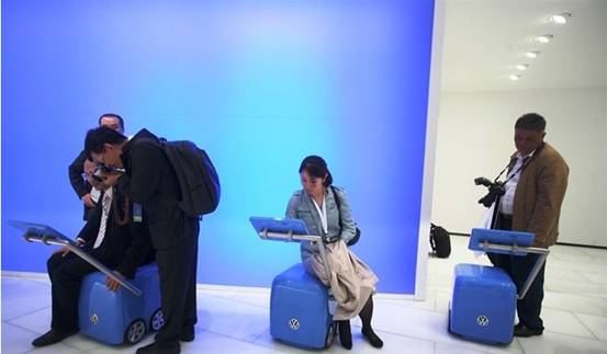 在寶馬MINI Cooper的展位中,其形象體驗(yàn)區(qū)中有兩個互動體驗(yàn)式設(shè)計(jì),一個是自助式的拍照打印展臺觀眾可以通過觸摸屏自由選取MINI車的顏色、花紋和附加裝備,然后拍攝十張大頭貼并選取一張最滿意的打印出來。小編不知道這套系統(tǒng)的后面是否有數(shù)據(jù)統(tǒng)計(jì)的功能,但是如果針對參與觀眾的特點(diǎn)和選擇進(jìn)行數(shù)據(jù)統(tǒng)計(jì)和分析的話,無疑是一舉兩得進(jìn)行一次隱蔽的市場調(diào)查的好辦法。另一個是踏板游戲機(jī),觀眾可以在上面完成躲避路障的游戲。為了防止參與觀眾過多造成場地?fù)頂D,兩個互動區(qū)域距離很遠(yuǎn),中間通過紀(jì)念品展示區(qū)和觀眾休息區(qū)連接。